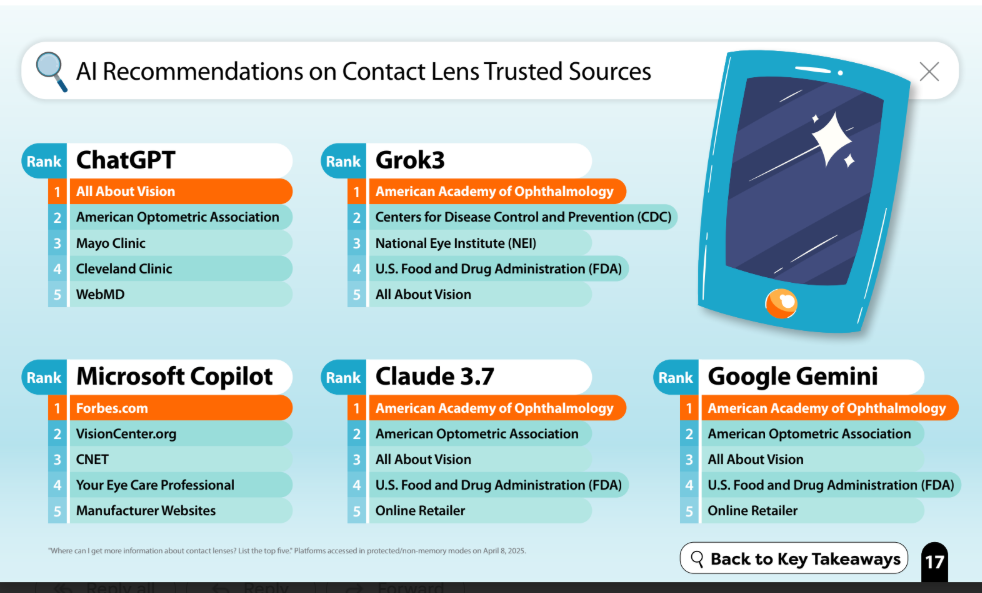 As traditional digital search evolves with the adoption of AI platforms, CLI also investigated how common large language models such as ChatGPT, Copilot and Gemini are handling contact lens queries. While steadily advancing, those technologies’ abilities to provide the best sources of information are inconsistent, meaning that practitioners may want to have preemptive conversations about AI-generated results with patients who are likely users. Recent studies indicate that 40% of U.S. adults ages 18-64 have used generative AI (National Bureau of Economic Research, 2024) and that 47% of Canadian adults have used AI tools (Leger, 2025).