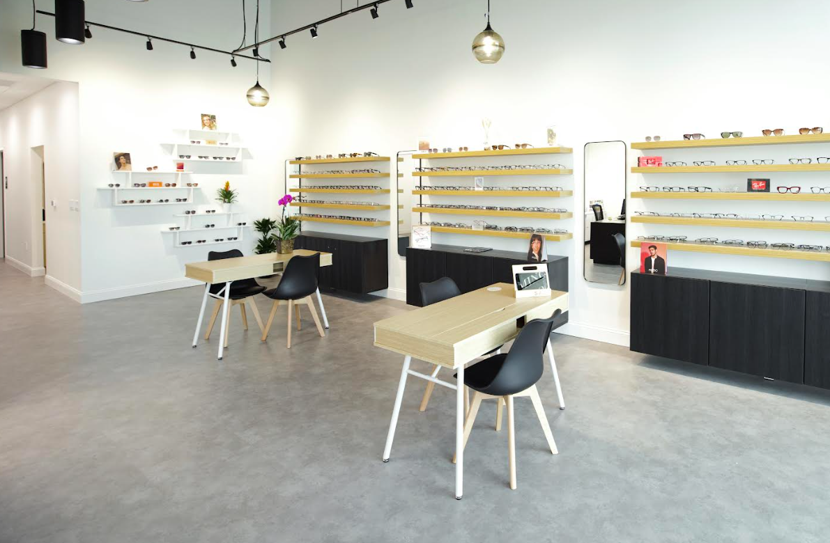 The aesthetic at Modern Vue Eyecare balances sleek modernity with natural elements. Two-story-high ceilings look even higher against bright white walls, black and gold accents and large front windows create an airy, welcoming environment. “The east-facing windows mean great light, but it also heats up the space in the morning,” Dr. Wei says. “It’s beautiful, but we’re going to need window treatments soon!”