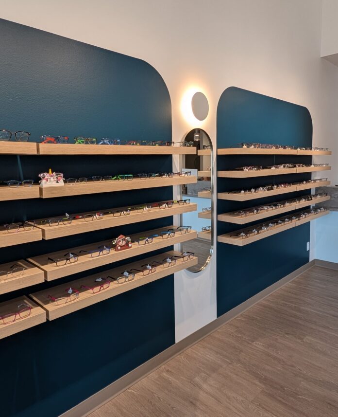 Cameron’s Vision in Cape Coral, Florida, features bright walls and floors and a curved, shiny, mosaic tile wall. Owner Jessica Cameron, OD, FAAO, says the wall is a statement piece and gets “so many compliments” on it.